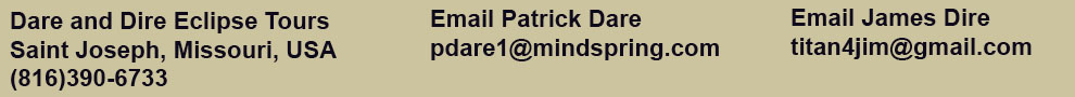 Leading this tour will be Dr. James Dire, an astronomer who has been leading solar eclipse tours for more than two decades, and Patrick Dare, a veteran international travel coordinator. Yes, those are our real names and we both were raised in St. Joseph, Missouri where we observed the Great American Solar Eclipse on August 27, 2017. We both have sisters named Carol Ann Dire (Dare's sister married Dire's brother) who were in the same second grade class at John Glenn Elementary school confusing the teacher immensely. This is all very spacy and we are all still very confused on names. But if you are the first person signing up for this tour with a last name Dere, Dore or Dure, you will be able to bring your sister for free if her name is Carol Ann. For more information on Dare or Dire click here on their names.